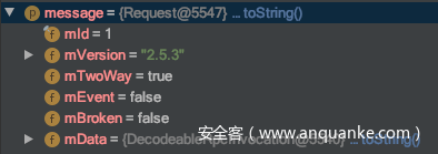 返回到DecodeHandler中,在第51行代码中传入的message参数是一个Request对象,该Request对象是dubbo的包中的,简单看一下该对象的详细信息