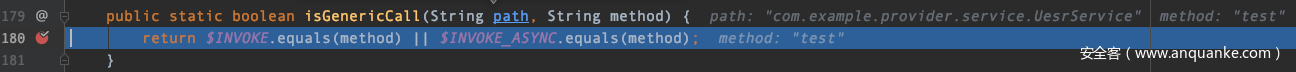 那么如何绕过该判断让程序继续执行下去从而触发远程代码执行,我们跟入RpcUtils.isGenericCall()方法中来仔细观察。