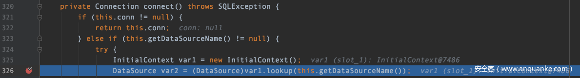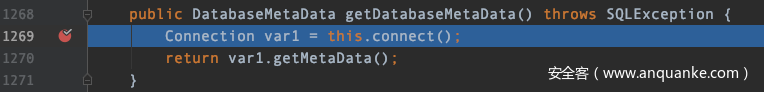 该toString方法中会通过反射不断调用JdbcRowSetImpl对象的各个方法,当反射调用JdbcRowSetImpl对象的getDatabaseMetaData方法时,会触发JDNI远程访问dataSource