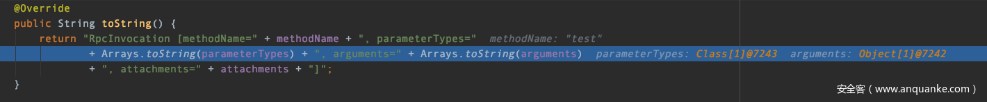 DecodeableRpcInvocation类的父类RpcInvocation重写了toString方法,看一下RpcInvocation.toString()方法的实现