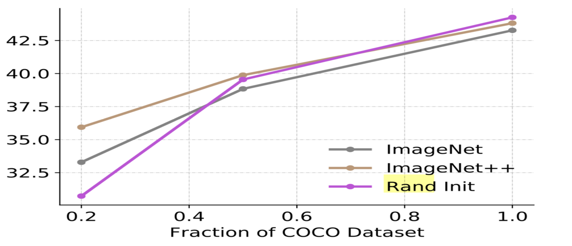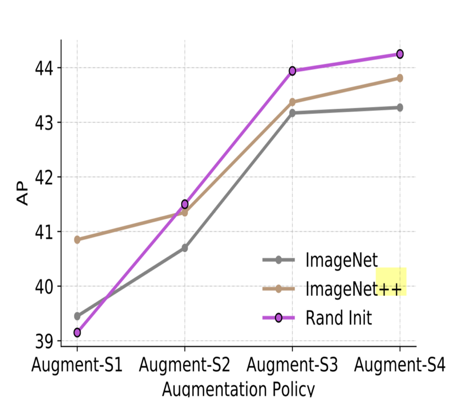 横轴为数据增强强度,纵轴为目标检测结果,Imagenet表示仅在Imagenet数据集上训练,Imagenet++表示使用了额外的数据扩充,Rand init表示骨干网络不使用预训练模型