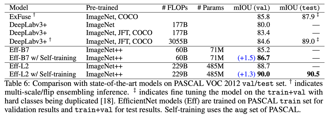 在语义分割方面,研究者也证明了自训练的预训练方式比监督式预训练可以达到更好的效果: