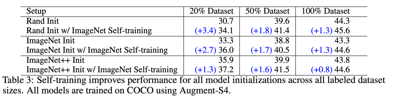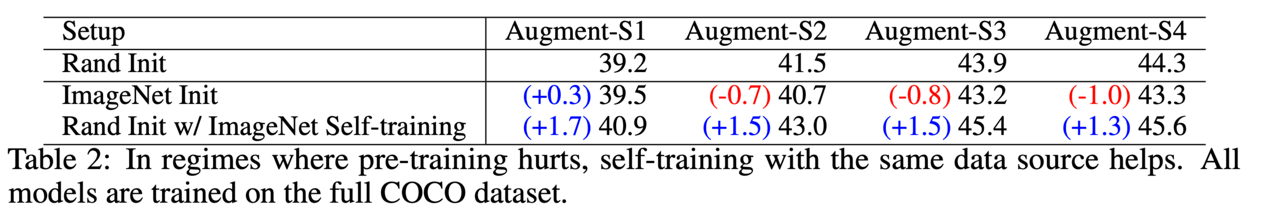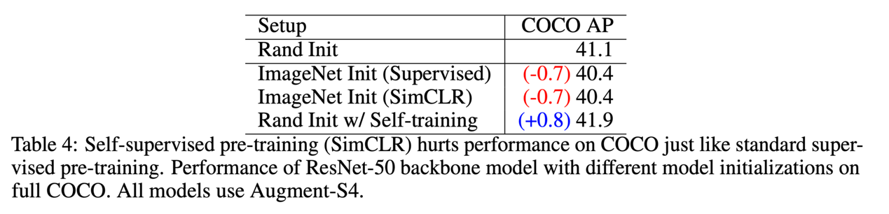 文中使用的自训练方法为noisy student training。在此使用Imagenet当作未标记的数据(不使用标签),而COCO数据集当作标记数据对预训练模型进行联合训练,以此更好的改善最终目标检测的效果。作为与监督预训练的对比结果如下: