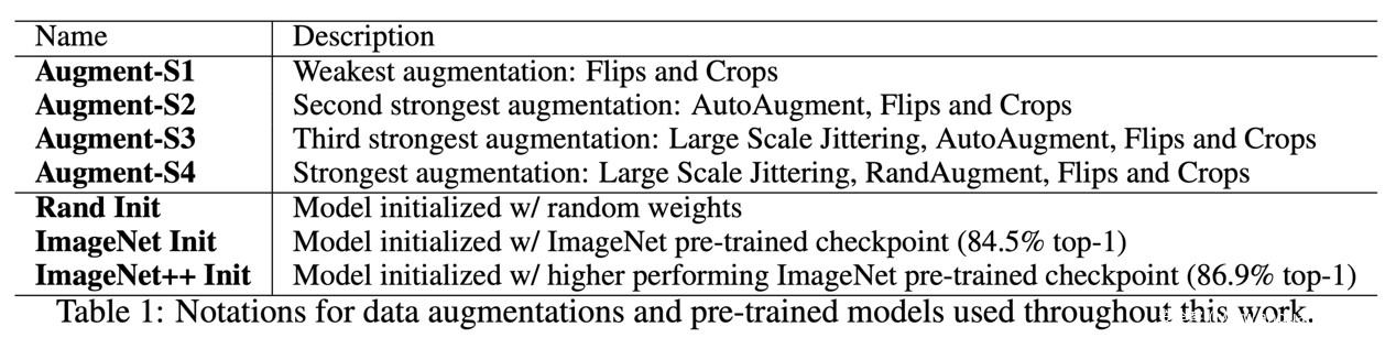 对于使用监督算法得到的预训练模型,研究者分别在使用了四种不同强度的数据增强的Imagenet上分别训练了EfficientNet-B7,之后将这些模型当作骨干网络在COCO数据集上训练目标检测模型。