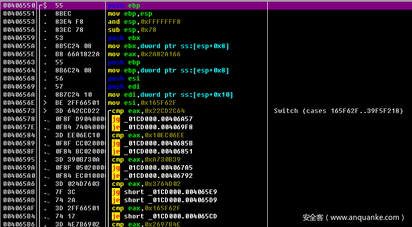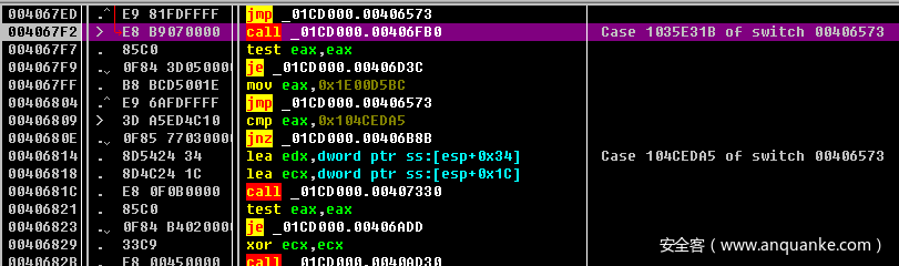从入口进去,可以发现这个函数像是被平坦化了的。被平坦化了的函数一般使用符号执行来解决比较好吧?(PS:还有其他好的办法请告诉我谢谢)。看到这种情况我还是打算好好的用OD调试+ida看吧,目前从ida这里看不出来啥。