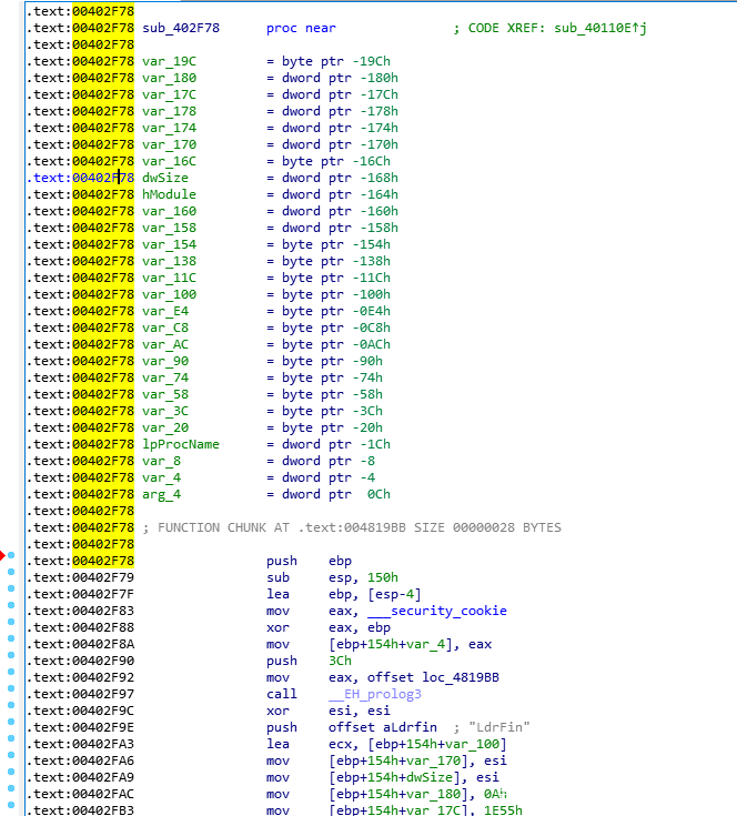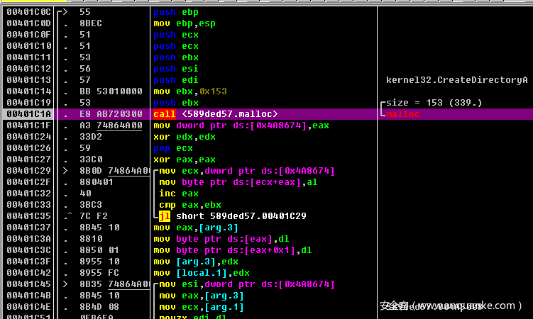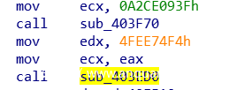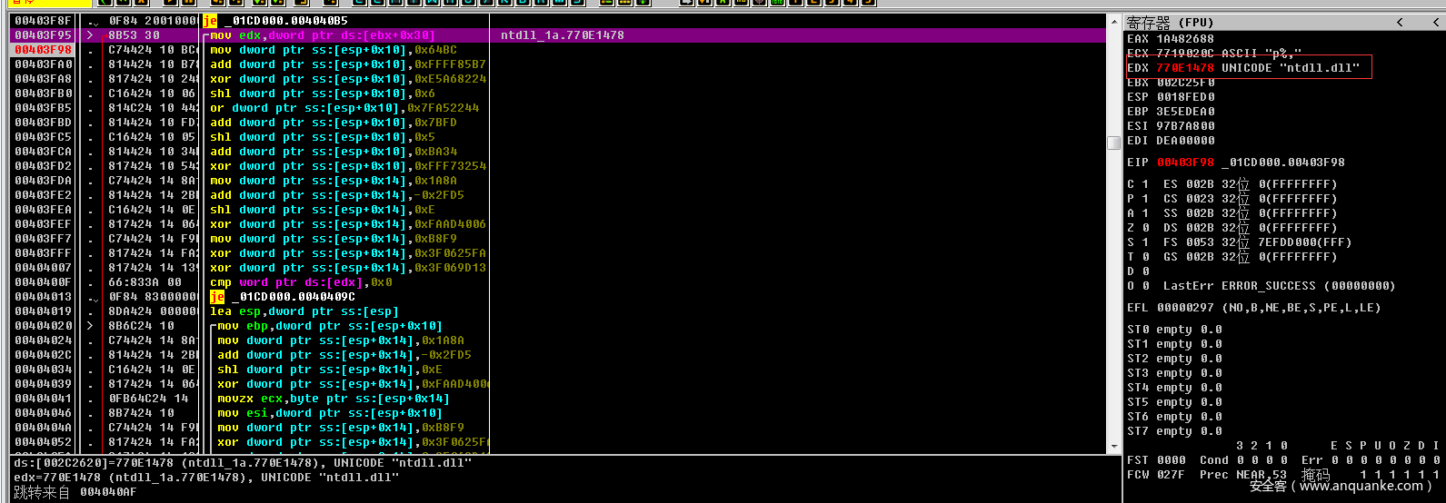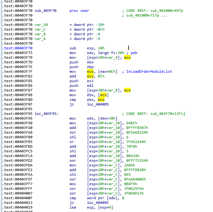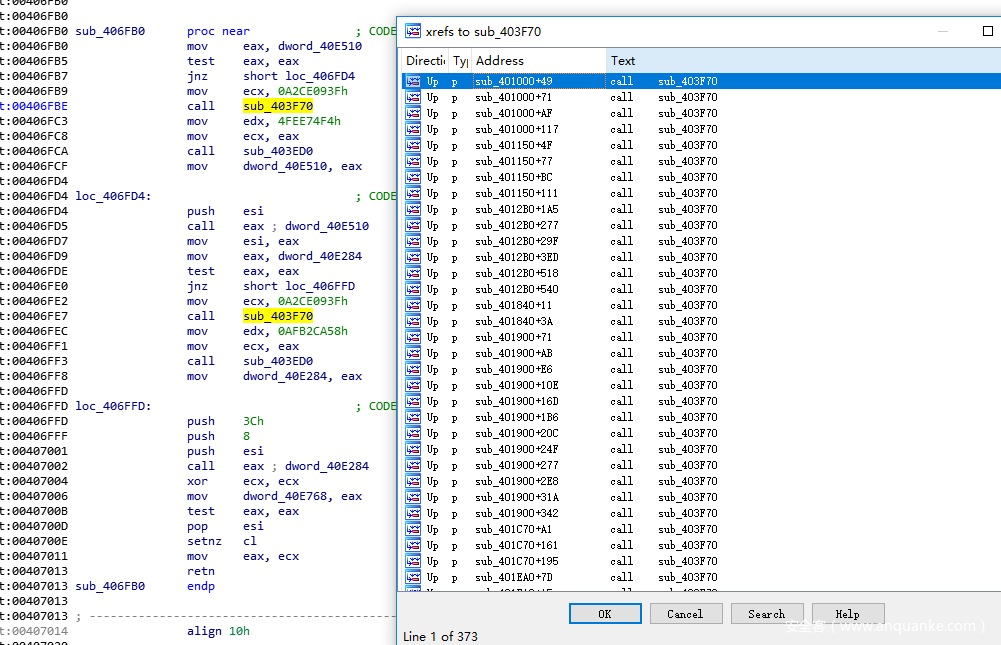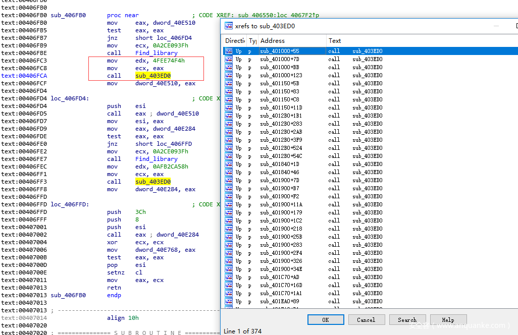 获取到dll地址后,然后就返回到上个函数可以看到sub_403ED0这个函数也是交叉引用很多的,发现使用了上个函数返回的dll地址,还有一个参数