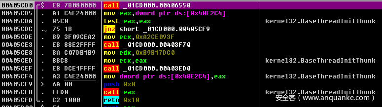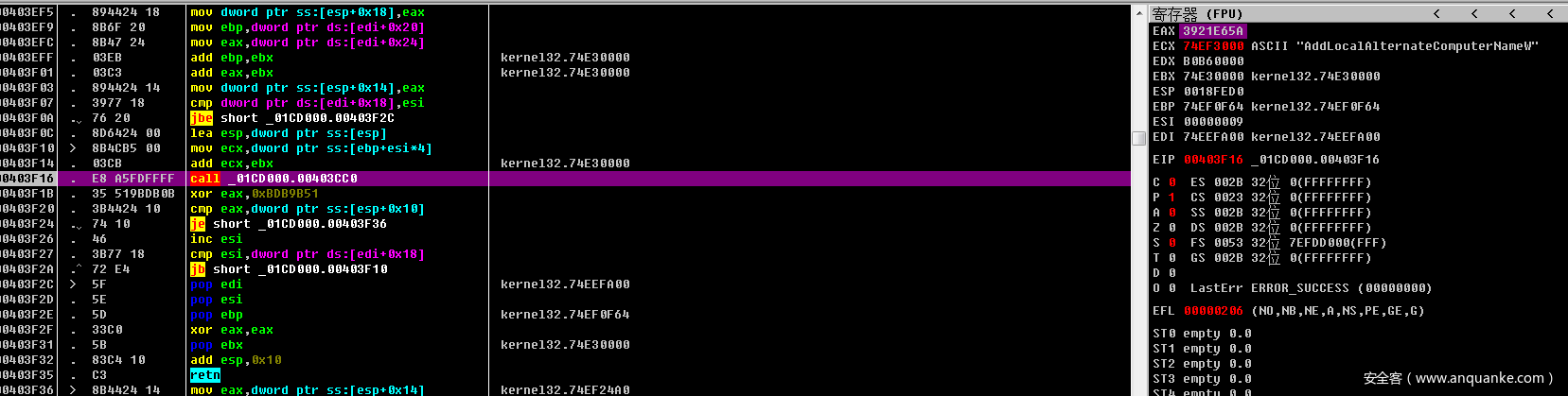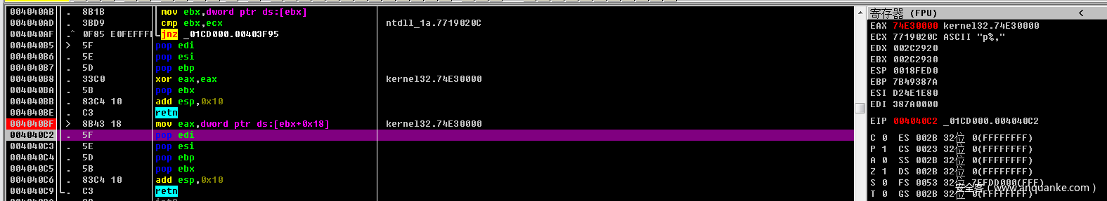 动态调试可以发现是在找dll地址(handle) 0A2CE093Fh这个的值对应的是kerenl32.dll