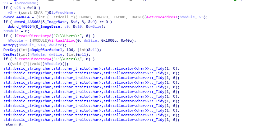 下面这块代码就是在调用上面的API寻找资源,然后申请内存空间然后解密