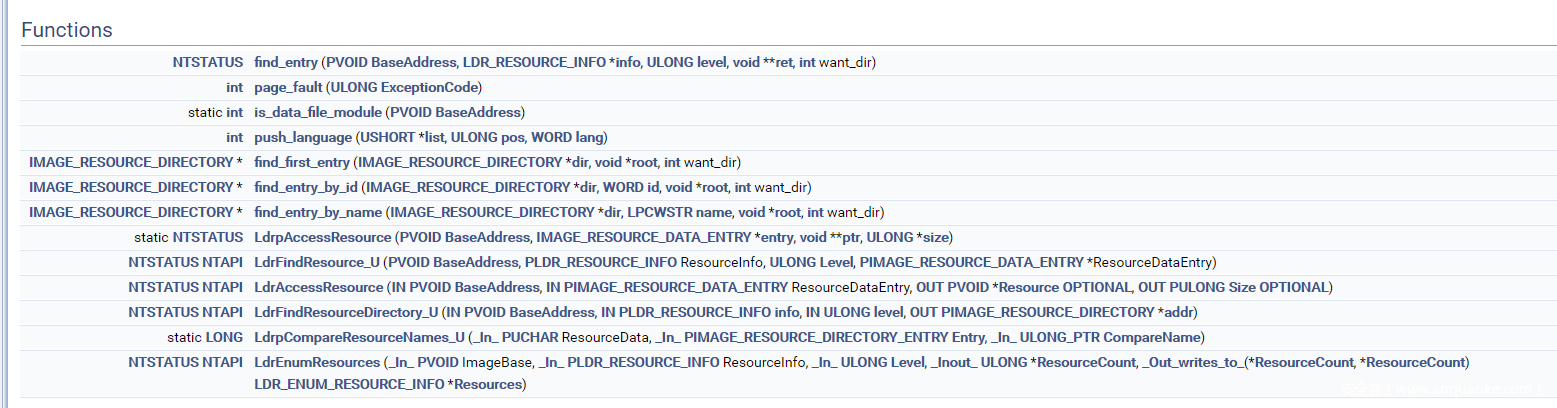 LdrFindResource_U和LdrAccessResource都是从NTdll中导出的API,LdrFindResource_U会根据资源ID找到相应的资源,如果找到,则返回相应的句柄,后续应该使用LdrAccessResource来使用该句柄。下面就是函数的声明,到这里也基本都知道流程了。