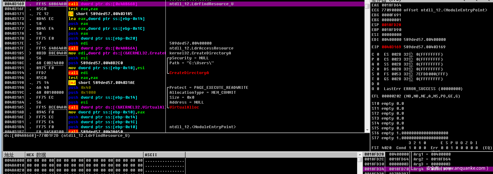 在资源解密的开头下断点,这些代码就是个PEloader感兴趣的话可以调试看看,这里就不浪费篇章讲解了