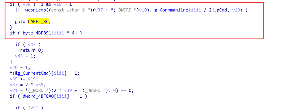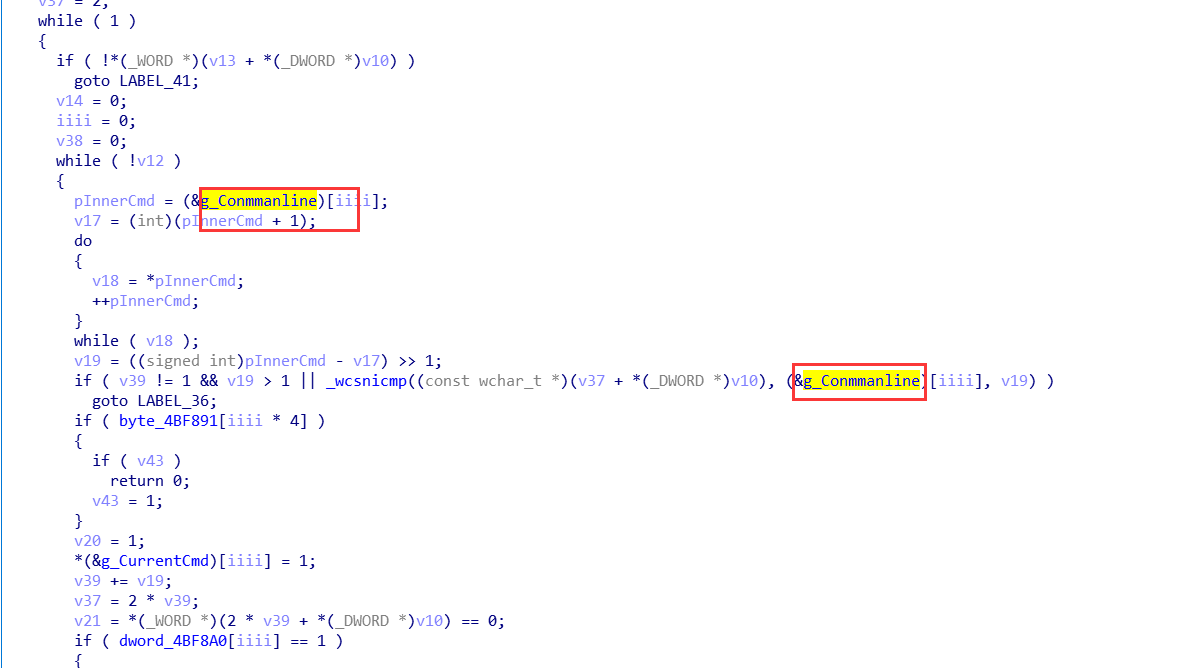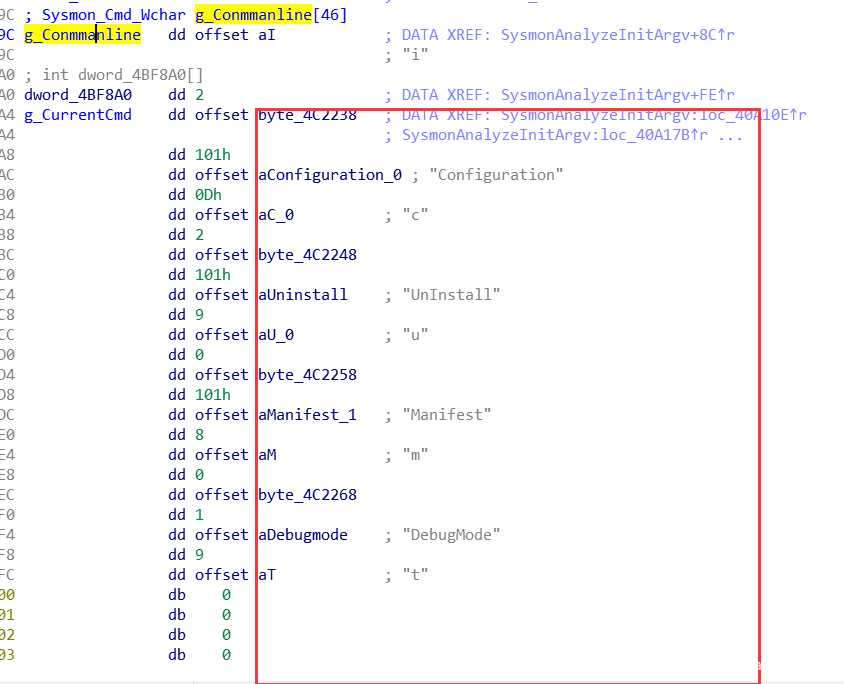 g_commandLine里固定存贮所有的sysmon参数,这里大概只列举出一部分,Install、i、Uninstall、Configuration、c、u、Manifest、m、DebugMode、nologo、AcceptEula、ConfigDefault、HashAlgorithms、NetworkConnect、ImageLoad、l、DriverName、ProcessAccess、CheckRevocation、PipeMonitoring等等。