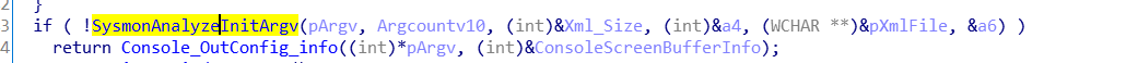 接下来sysmon会对参数进行检查,检查是否config、configuration、h、–nologon、?、help,非这些参数后,然后会接着解析具体的参数,根据参数是否加载规则。