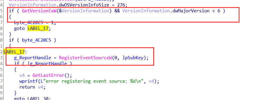 这里可以看到如果操作系统主版本,如果是vista之前的操作系统使用ReportEvent,如果是vista以及以上操作系统则使用EventWrite函数。