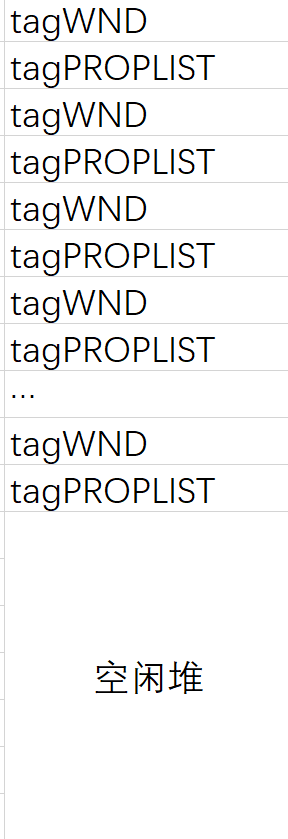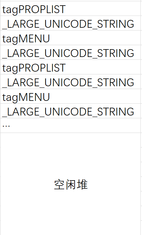 上面的代码对_LARGE_UNICODE_STRING结构进行初始化以及设置,涉及到RtlInitLargeUnicodeString和NtUserDefSetText函数,对tagPROPLIST结构的设置,涉及到SetPropA函数,对tagMENU结构的设置,堆喷完的结果如下图所示,四个一组,依次循环