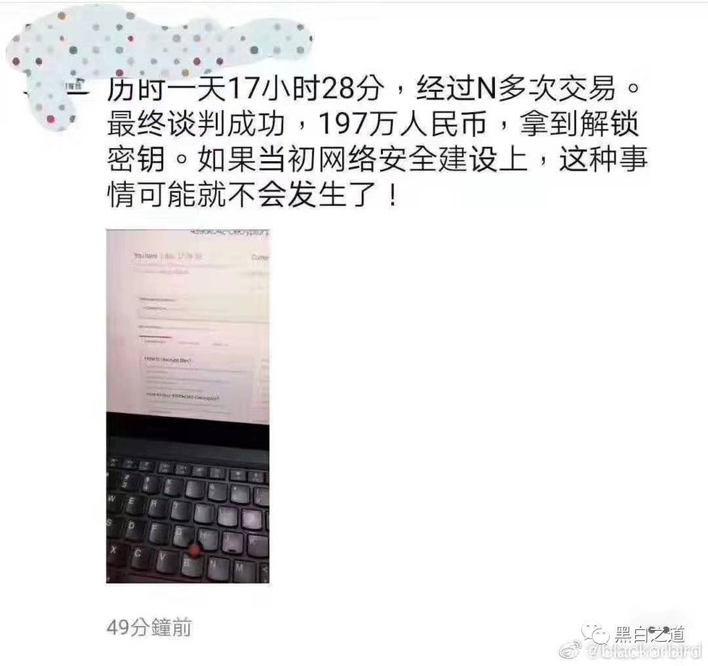 很多公司愿意拿197万去解密,也不在网络安全前期多投入,大部分抱着这样的心理,倒霉事不会发生在我们公司身上,出事之后就后悔,只有后悔药才能解决此类公司的问题。勒索病毒现在是一个暴利行业,前些天墨西哥毒品大佬转行勒索病毒,后来是被抓住了。几个月前有一黑客小组做了一年勒索病毒,赚了20亿美金接着金盆洗手成功上岸。就因为暴利行业就会有很多人从事这个行业,不乏专业人士。