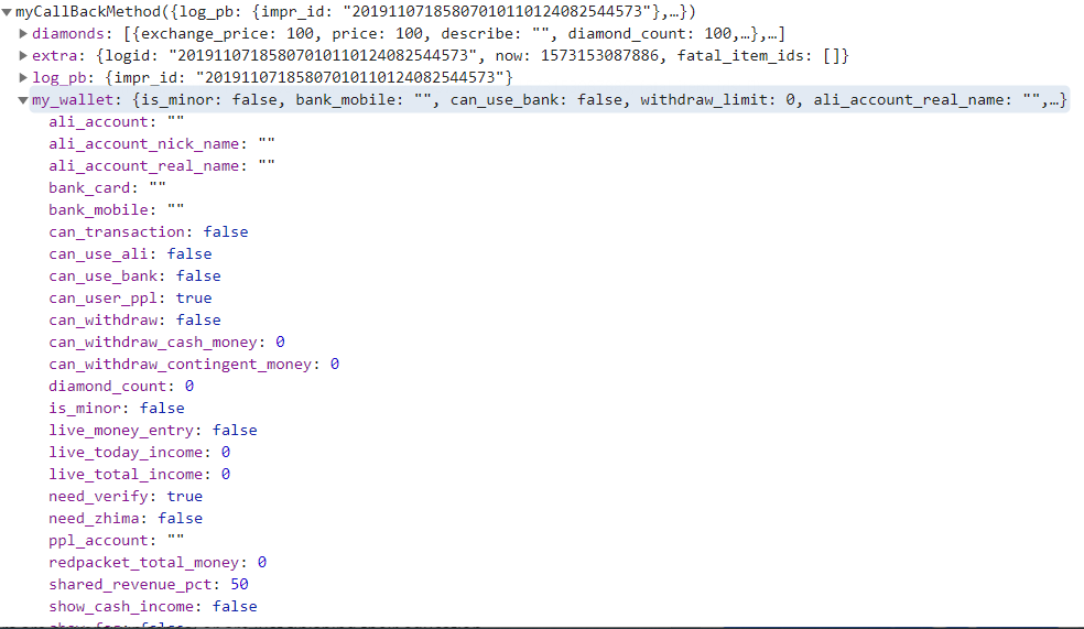 如下图所示,我们可以通过AJAX请求,获取与受害者钱包有关的所有敏感信息。请求中包含一个callback参数,参数值为待执行的JavaScript函数(myCallBackMethod):