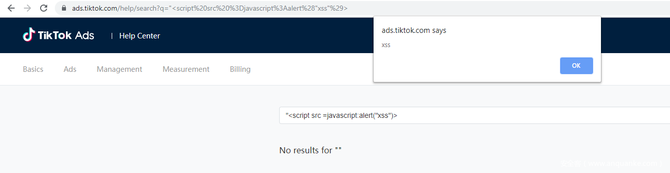 进一步研究后,我们发现TikTok的某个子域名(https://ads.tiktok.com)存在XSS漏洞,攻击者可以将恶意脚本注入可信站点。