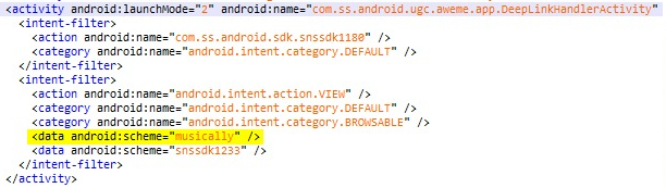 在逆向分析Android版TikTok应用时,我们发现该应用包含一个“deep links”(深度链接)功能,可以通过浏览器链接调用应用中的intent。