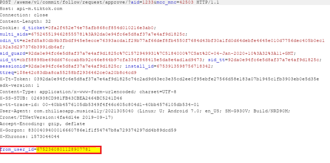 攻击者可以将from_user_id参数值修改为自己的id,然后向TikTok服务器发送请求: