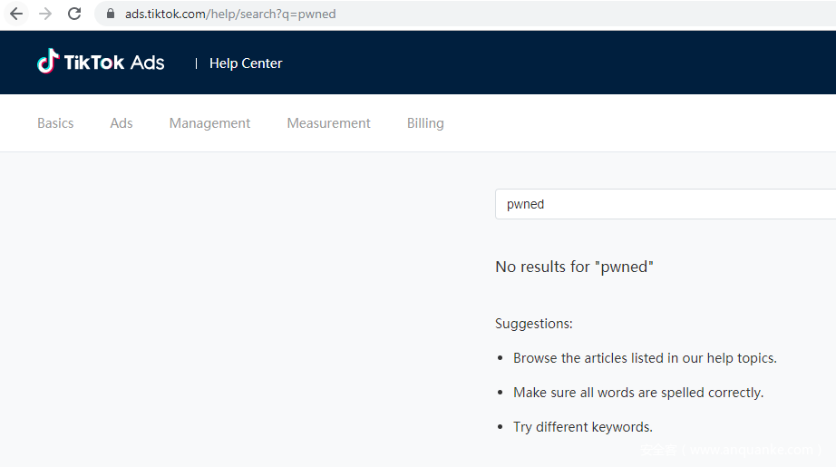 ads子域名包含一个帮助中心,用户可以了解如何在TikTok中创建并发布广告。帮助中心地址为https://ads.tiktok.com/help/,其中包含一个搜索漏洞。
