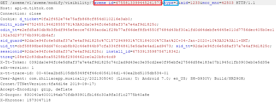 https://api-m.tiktok.com/aweme/v1/aweme/modify/visibility/?aweme_id=video_id&type=1&aid=1233&mcc_mnc=42503