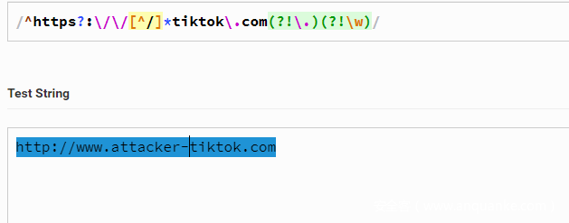 redirection参数会将用户重定向到TikTok所属域名的网页,TikTok采用如下正则表达式来验证域名是否满足要求(只在客户端验证):