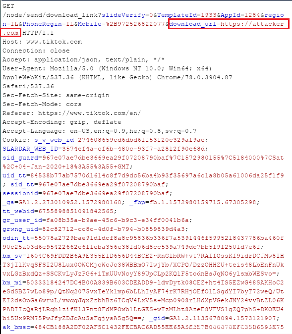 此时我们已经掌握了2个不同的缺陷:如果受害者点击了我们发送的链接,就能以该受害者身份执行JavaScript代码(参考前文的“SMS链接欺诈”);以及重定向攻击(参考前文的“域名正则验证”),将用户重定向到恶意站点,执行JavaScript代码,使用受害者cookie向TikTok发送请求。