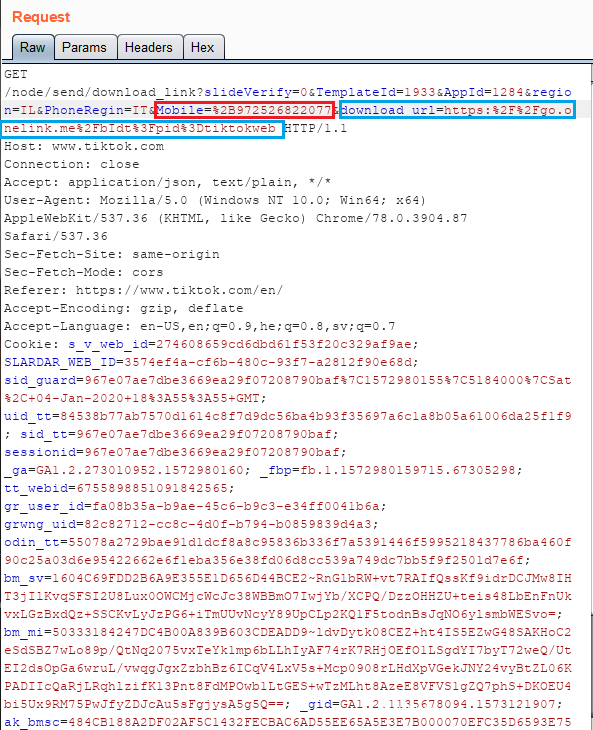 如果攻击者希望向目标用户发送SMS消息,可以使用代理工具(如Burp Suite)抓取HTTP请求。请求中的Mobile参数包含待发送SMS消息的手机号码,download_url参数为SMS消息中显示的下载链接。