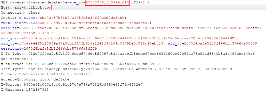 通过前文描述的JavaScript执行方式,我们可以指定aweme_id参数值(即视频id),发送HTTP GET请求,删除攻击者指定的视频。