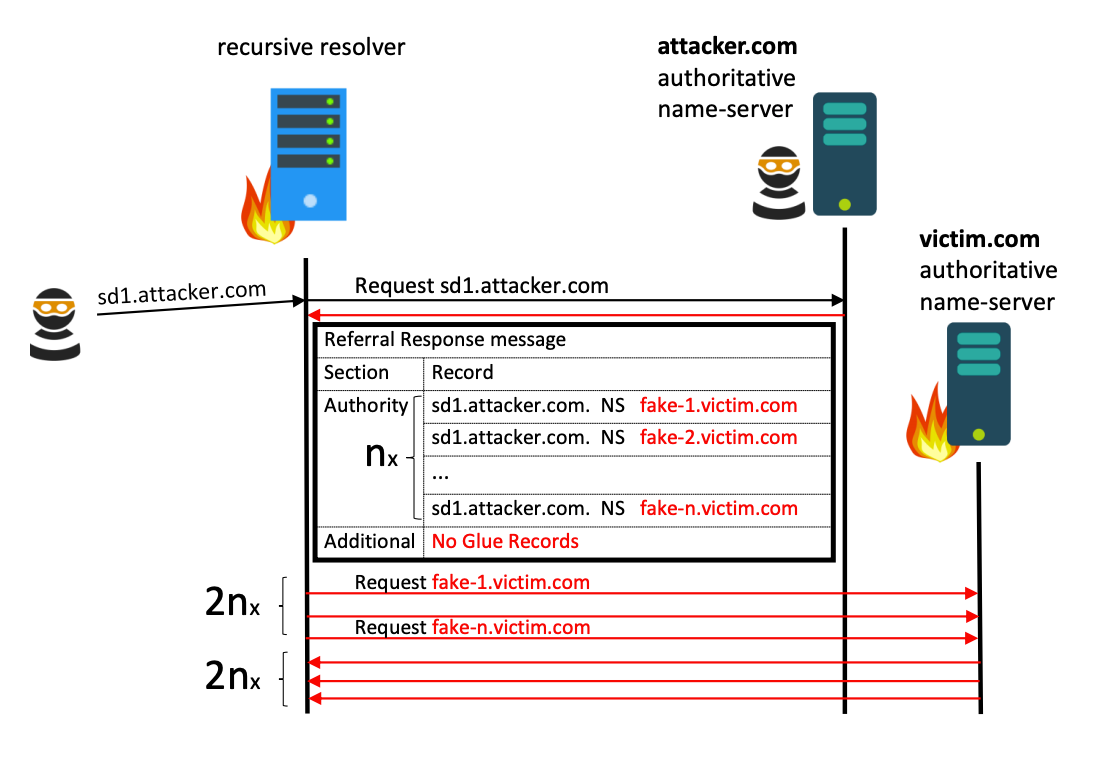 DNS协议 存在 实现上的逻辑错误,攻击者 通过 发起指向恶意name-server 的DNS查询请求,可以造成 递归服务器/特定域名服务器拒绝服务影响。