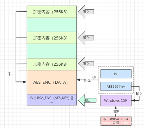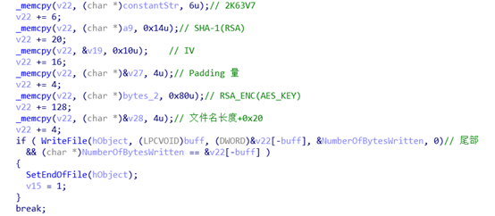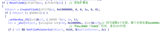 如果文件大于1.5MB,病毒则为原文件添加扩展名,从文件首部、中部、尾部分别读取256KB内容进行加密,加密结果写于文件尾部,读取的数据原本位置将被全部置0。