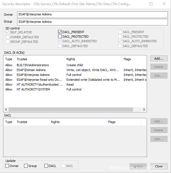 知道DCShadow攻击的操作过程后,我们需要理解具备哪种权限才能在Configuration区中创建nTDSDSA对象。快速查看权限方面信息后,我们发现只有BUILTINAdministrators、DOMAINDomain Admins、 DOMAINEnterprise Admins以及NT AUTHORITYSYSTEM具备目标容器的控制权限。