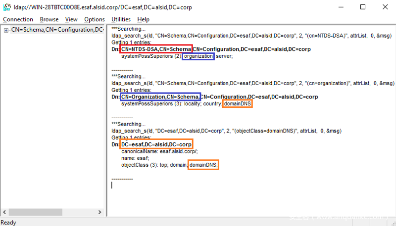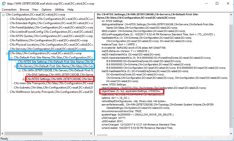 图6. 蓝色框中为存储NTDS-DSA对象的容器,红色框中为NTDS-DSA对象