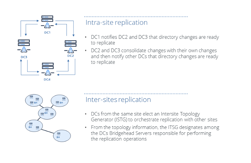 KCC的主要功能是生成并维护站点内复制以及站点间复制的拓扑。也就是说,KCC进程可以决定DC之间的链接关系,以创建有效的复制过程。对于站点内复制,每个KCC会生成自己的复制链接。对于站点间复制,每个站点上的KCC会生成所有的复制链接。这两种复制模式如下图所示: