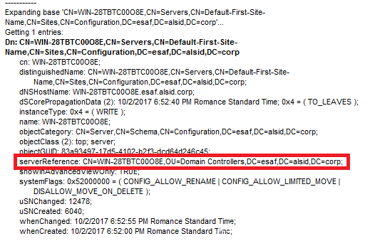 恶意服务器可以通过有效的计算机账户成为可信的AD服务器。Kerberos SPN属性可以为其他DC提供身份认证支持。因此,每个nTDSDSA对象会通过serverReference属性链接到computer对象。
