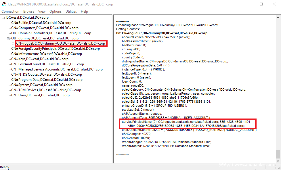 比如,我们的恶意服务器(在alsid.corp域中DSA GUID为8515DDE8–1CE8–44E5–9C34–8A187C454208的roguedc)所需的两个SPN如下所示: