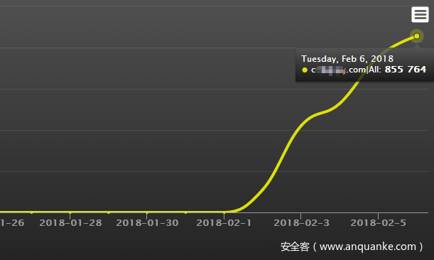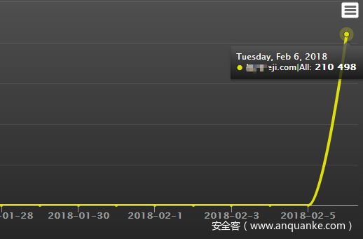 从iframe进去的两个域名注册信息看一个是2018年2月2号注册并且加了隐私保护,注册后域名请求量即出现指数级的增长,另一个是2012年注册。