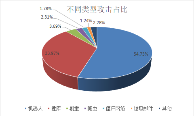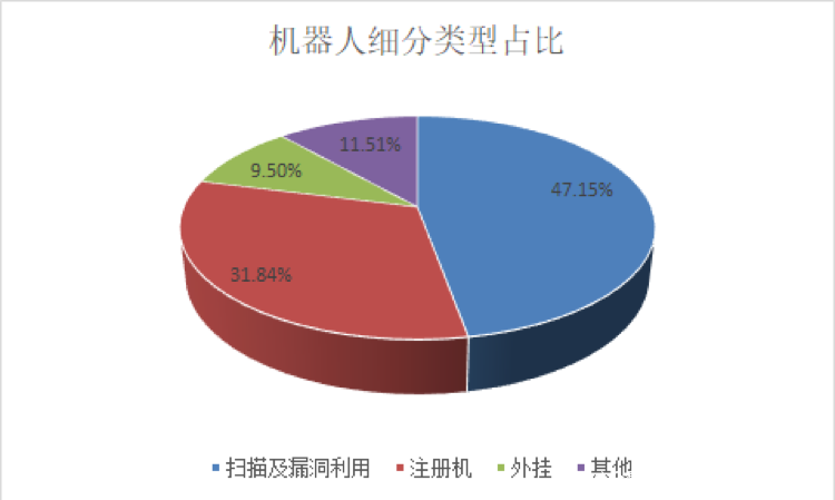 通过对攻击流量中行为特征的提取,我们发现,超过五成的攻击为机器人所为。这些机器人中绝大部分用来执行互联网扫描或漏洞利用动作,其中大部分(超过70%)为最为常见的批量端口扫描器,约两成源自针对特定目标的自动化漏洞扫描与利用工具(如Struts2-045/048系列漏洞),另有约一成应与国家监管部门、安全厂商和科研机构的互联网资产探测类系统有关。此外,还有极少部分机器人是针对公有云企业邮箱的注册机。