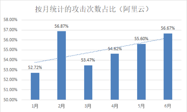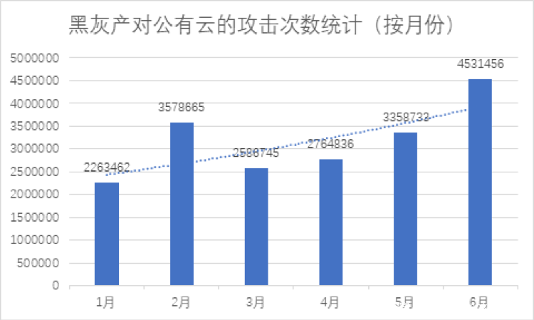 通过对相关攻击行为按月进行次数统计,我们可以看到,在排除2月份春节期间大规模企业营销活动所造成的数据样本偏差影响后,黑灰产对公有云的攻击次数呈明显的上升趋势。
