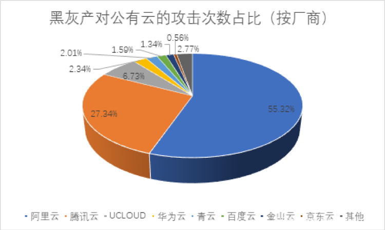 在国内公有云厂商中,针对阿里云的攻击次数占比最高,达55.32%,针对腾讯云的攻击次数占比居第二,为27.34%,其他依次是UCLOUD、华为云、青云、百度云、金山云、京东云。这与国内公有云厂商的市场份额占比排名基本趋同(此处忽略了部分公有云厂商较细微的市场份额差异)。
