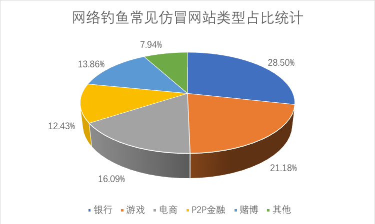 我们通过对各公有云中网络钓鱼类非法内容的数据统计发现,钓鱼网站最常见的仿冒网站类型分别是:银行、游戏、电商、P2P金融、赌博。