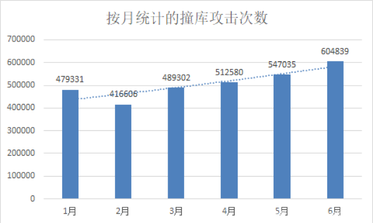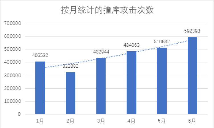 除自动化扫描或漏洞利用行为外,有14.36%的攻击行为为撞库攻击。对此类攻击行为按月进行次数统计,可以看到有明显的上升趋势(排除2月份春节的数据样本偏差影响)。