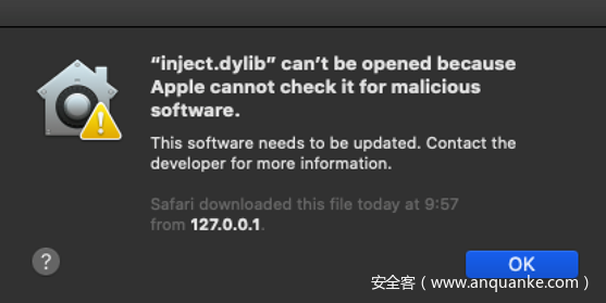 如果我使用另一个证书,那么dylib将无法正常加载,如下所示。需要注意的是,这种验证机制始终存在,并不是Gatekeeper执行的操作。