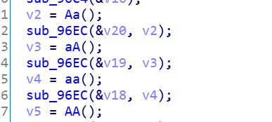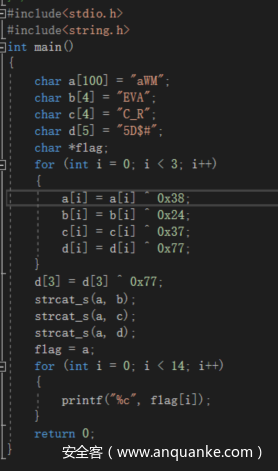 test中用到了Aa(),aA(),aa(),AA()函数,每次和不同的值进行异或加密,字符串分别为aWM,EVA,C_R,5D$#,使用vs写下解密脚本