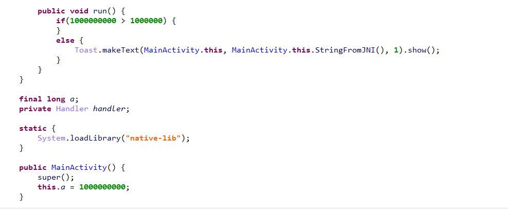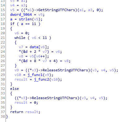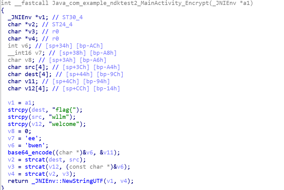 看着好像是flag中一部分通过base64加密后和flag{wllmwelcome拼接起来,最后试着提交密码,发现是错误的,因为这里的方法被混淆了,查看JNI_Onload