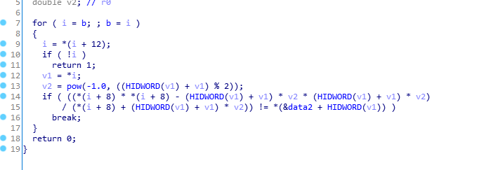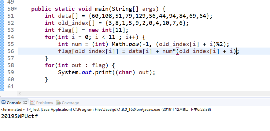 这里进行了计算(x^2-y^2)/(x+y),化简就是x-y,其中x表示的是数据的值,y表示 -1 的(b中的下标+原始下标)%2次方*(b中的下标+原始下标)。计算后与已知数据逐位比较。那么我们就需要将已知的数据按照data的值还原,然后计算就是flag了,附上代码