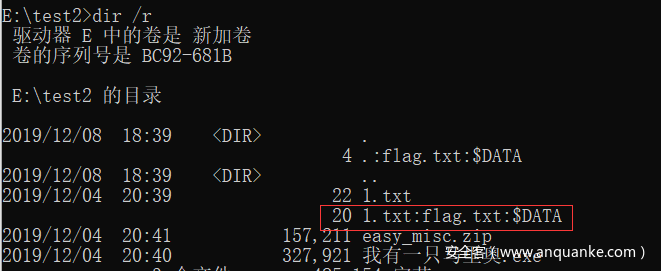 查看 ntfs提示 ,百度一下就好了,1.txt其实”寄生“着flag.txt这样一个数据流文件文件