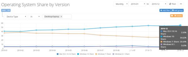 2019年,Windows 7系统在全球还有26.64%的市场份额,Windows 10占比升至54.62%。